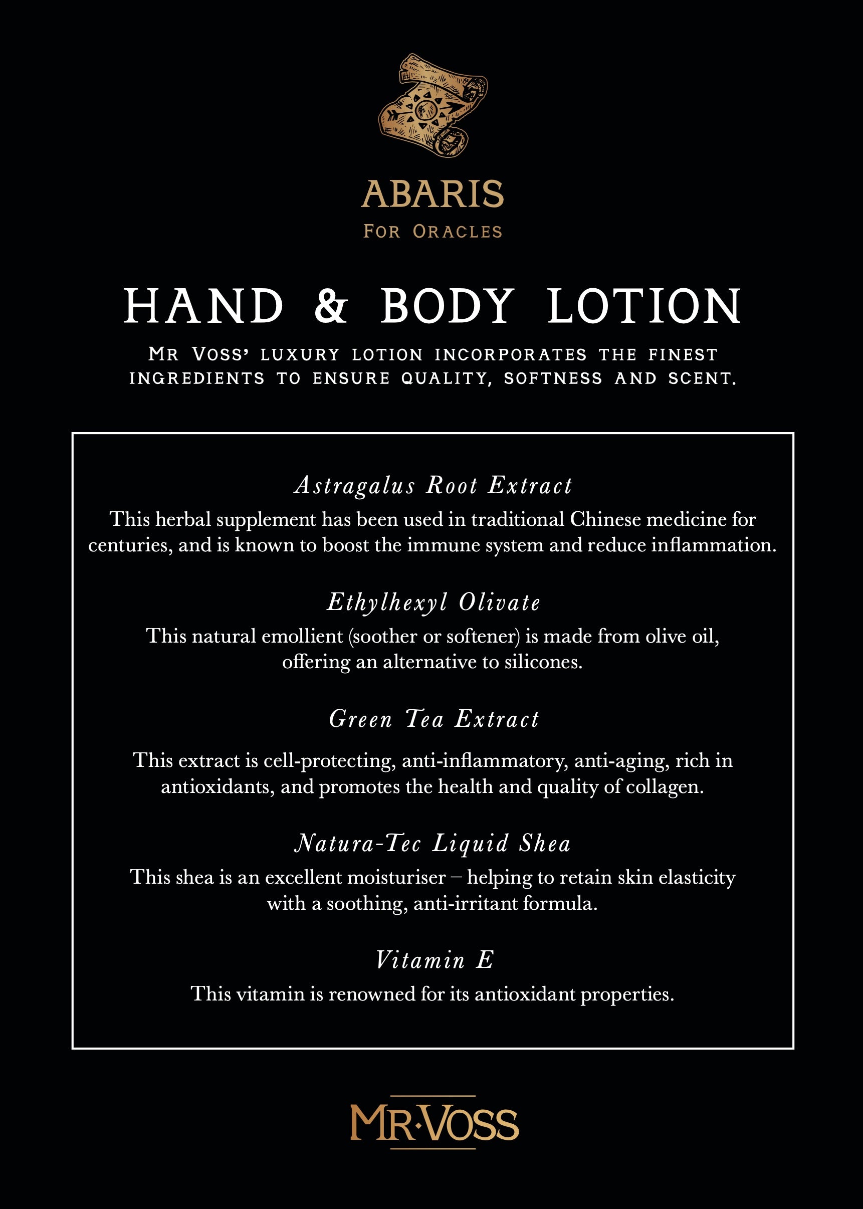 • Vitamin E, Astragalus Root Extract & Green Tea Extract (Lotion): Antioxidants and botanicals help protect, soothe, and strengthen the skin.