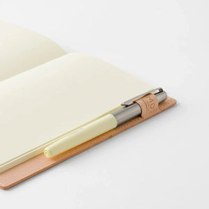 The cover wraps the B6 Slim MD Notebook precisely, held in place by folded inner flaps rather than clips or elastic. On the inside, two card slots sit flush against the inner covers, useful for a transit card, a folded receipt, or a few stamps. The pen loop is integrated into the spine edge of the cover; when not in use it lies flat, adding no ridge or bump beneath your writing hand.